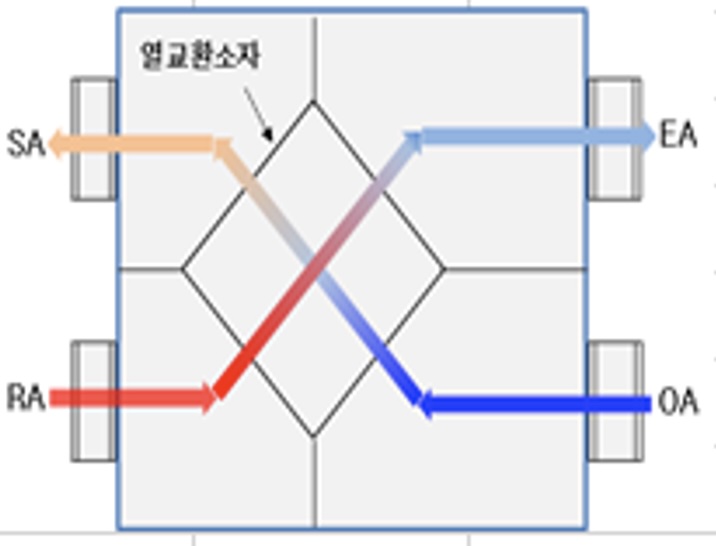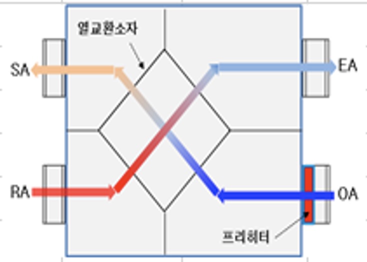 공기 중의 에너지는 높은 곳에서 낮은 곳으로 이동하므로 실내에서 오염된 공기를 배출시킬 때 배출 공기중의 열과 습기(에너지)가 실내로 들어오는 차갑고 건조한 공기쪽으로 이동하여 열 및 습도의 손실이 많이 발생하지 않고, 실내의 오염원이 재 유입되지 않도록 수분만 통과하는 특수 페이퍼로 구성되어진 전열 교환소자를 적용.