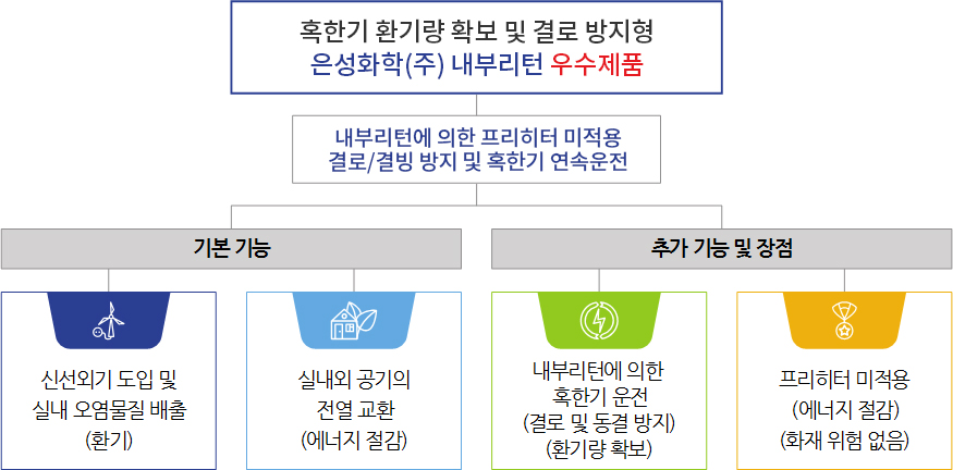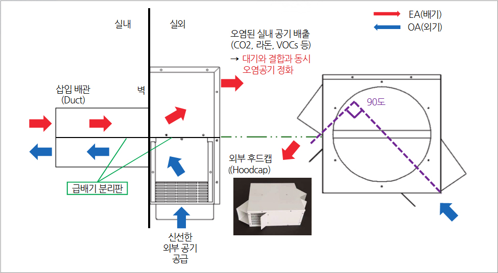 - 내부 리턴 : 댐퍼와 자동 온도 제어로 배기열 회수 및 결로 방지, 연속 환기 가능