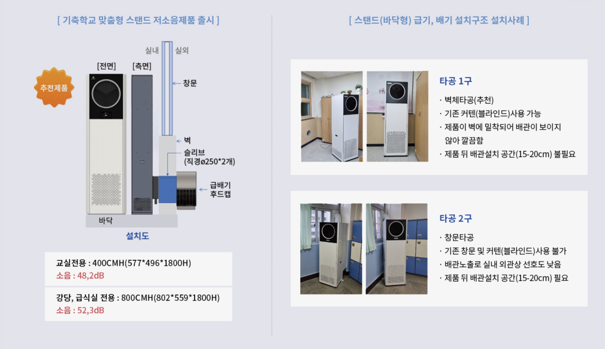 스탠드 400,800CMH 설치 소음 및 설치유형 (벽체타공, 유리타공설치사례)